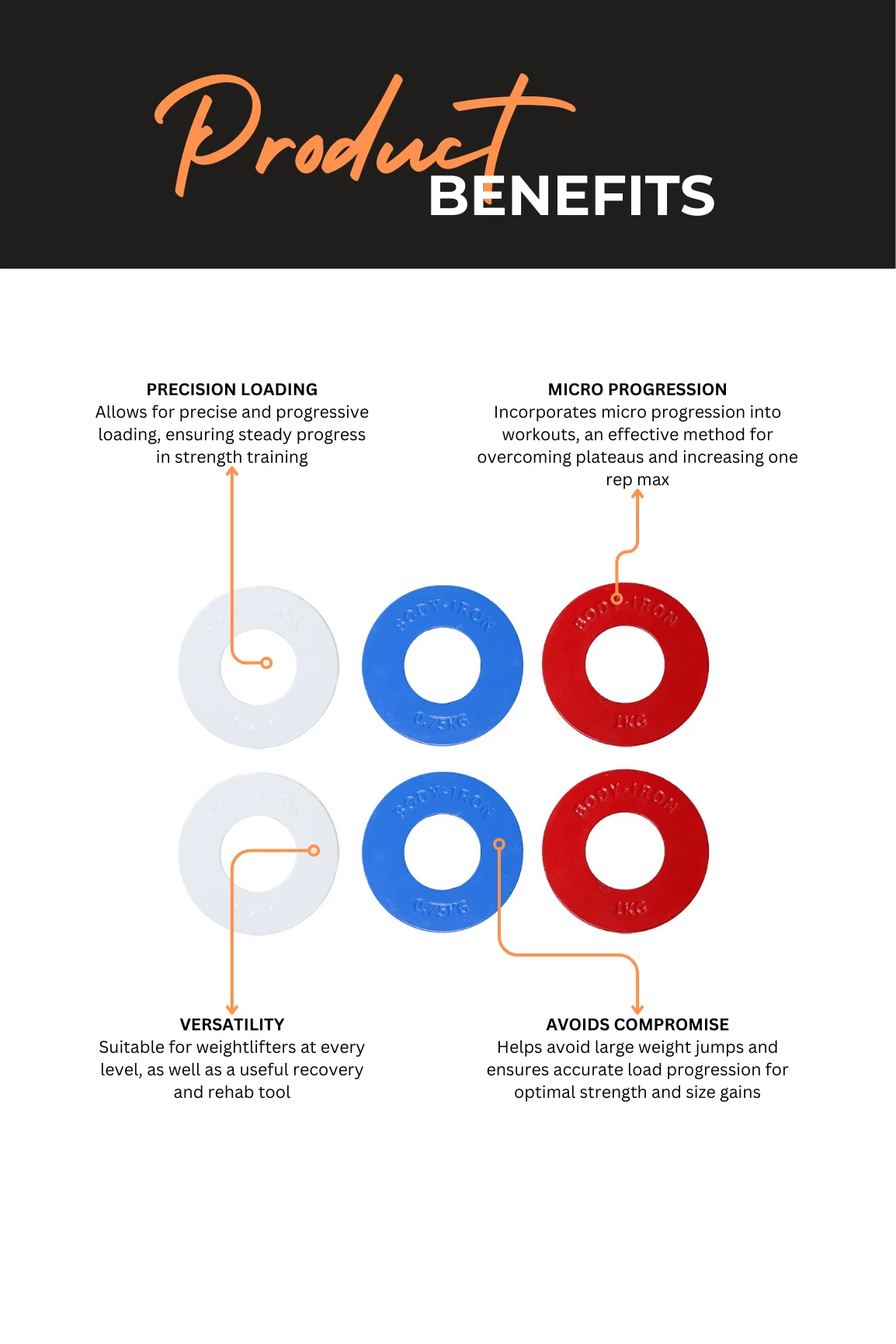 By adding these Olympic fractional plates onto your barbell you’ll be incorporating micro progression into your workout program, an easy yet effective method for overcoming training plateaus and upping your one rep max. Since accurate load progression is key for strength and size gains, fractional plates are a great tool to guarantee steady progress in the gym. This allows an athlete or anyone serious about strength training to avoid large weight jumps or any compromise to their training program.