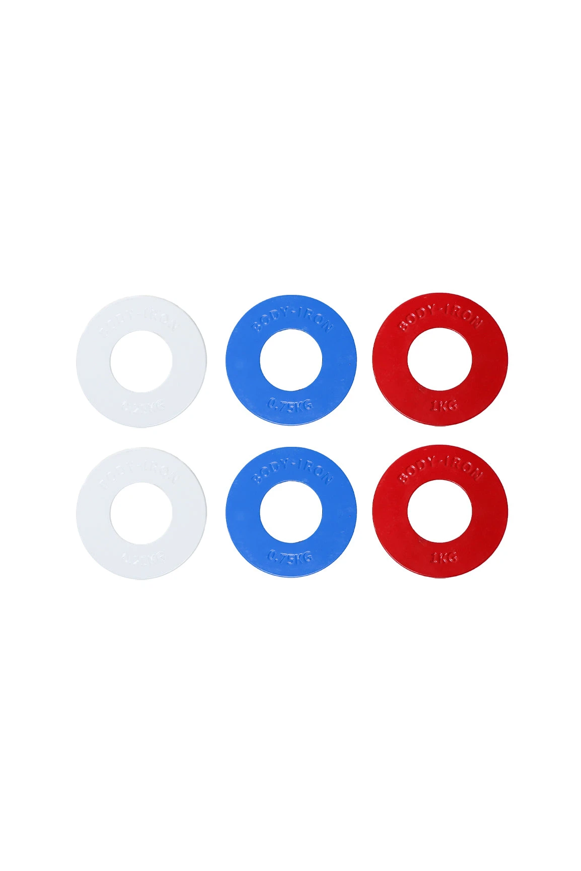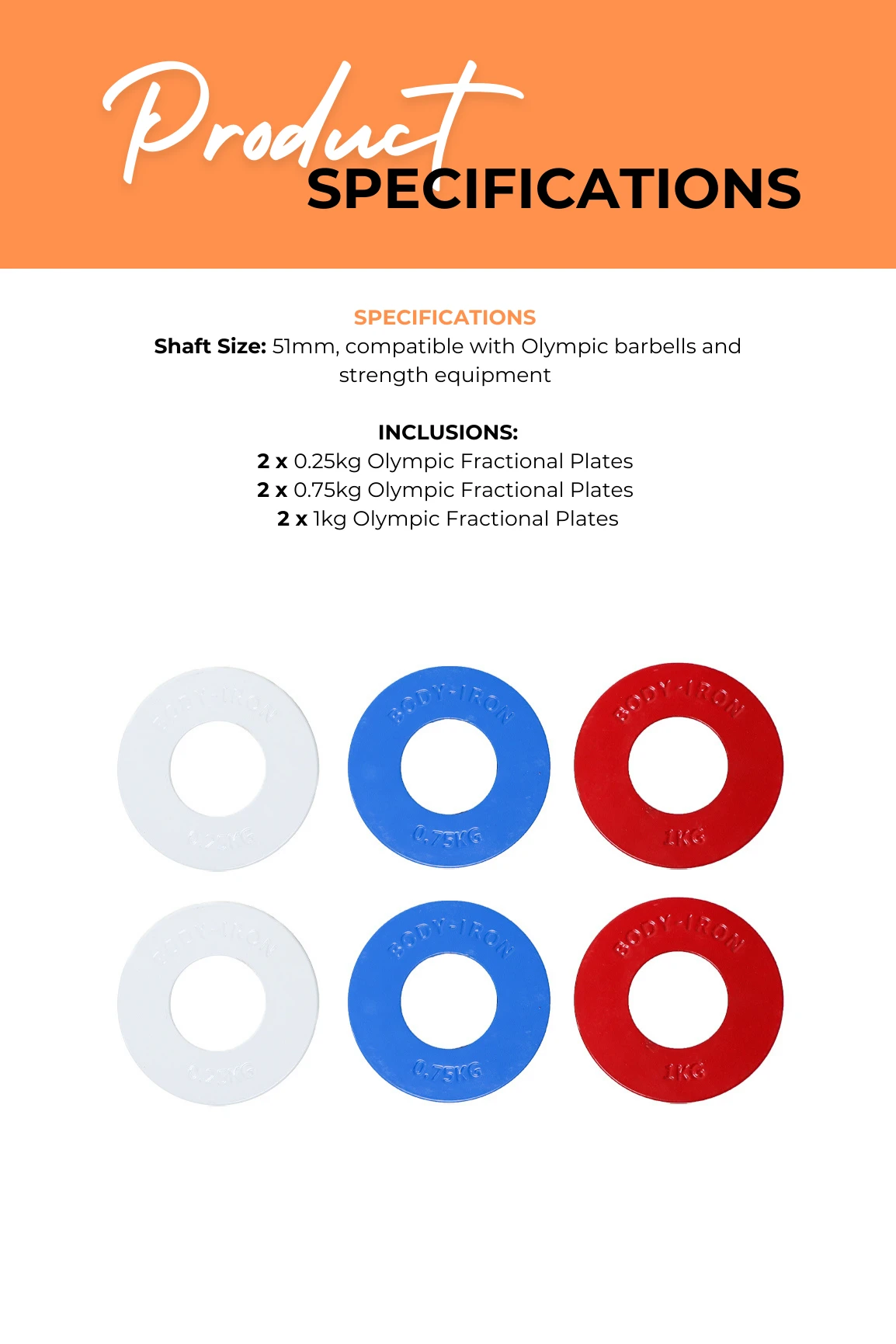 This Body Iron weight plate pack comes with three pairs of fractional plates, ranging from 0.25kg – 1kg.Â