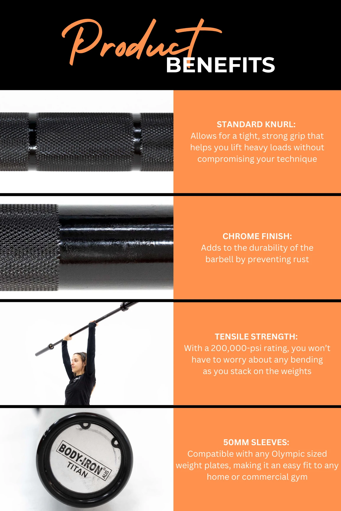 Not made for the faint hearted, the Body Iron 7ft Titan Olympic barbell is going to take your strength training to the next level!