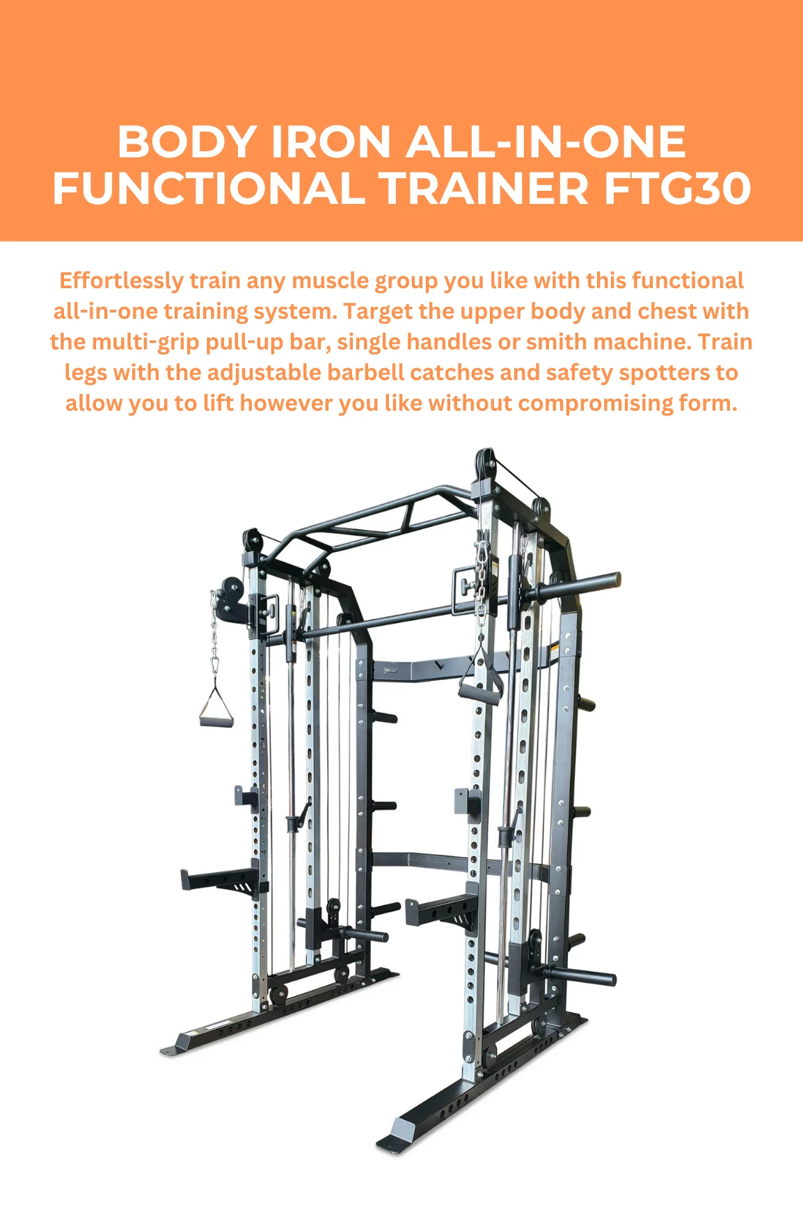 Combining a smith machine, Olympic free-weight rack and a functional trainer into one super-powered machine, the Body Iron All-In-One Functional Trainer FTG30 has just changed the fitness equipment game, offering everything you need for the perfect workout.