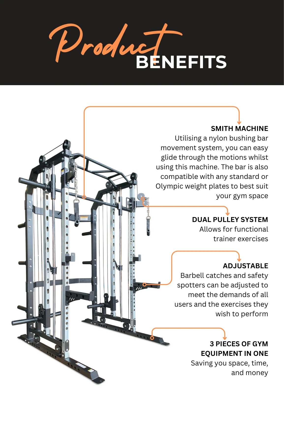 - SMITH MACHINE: utilising a nylon bushing bar movement system, you can easy glide through the motions whilst using this machine. The bar is also compatible with any standard or Olympic weight plates to best suit your gym space.