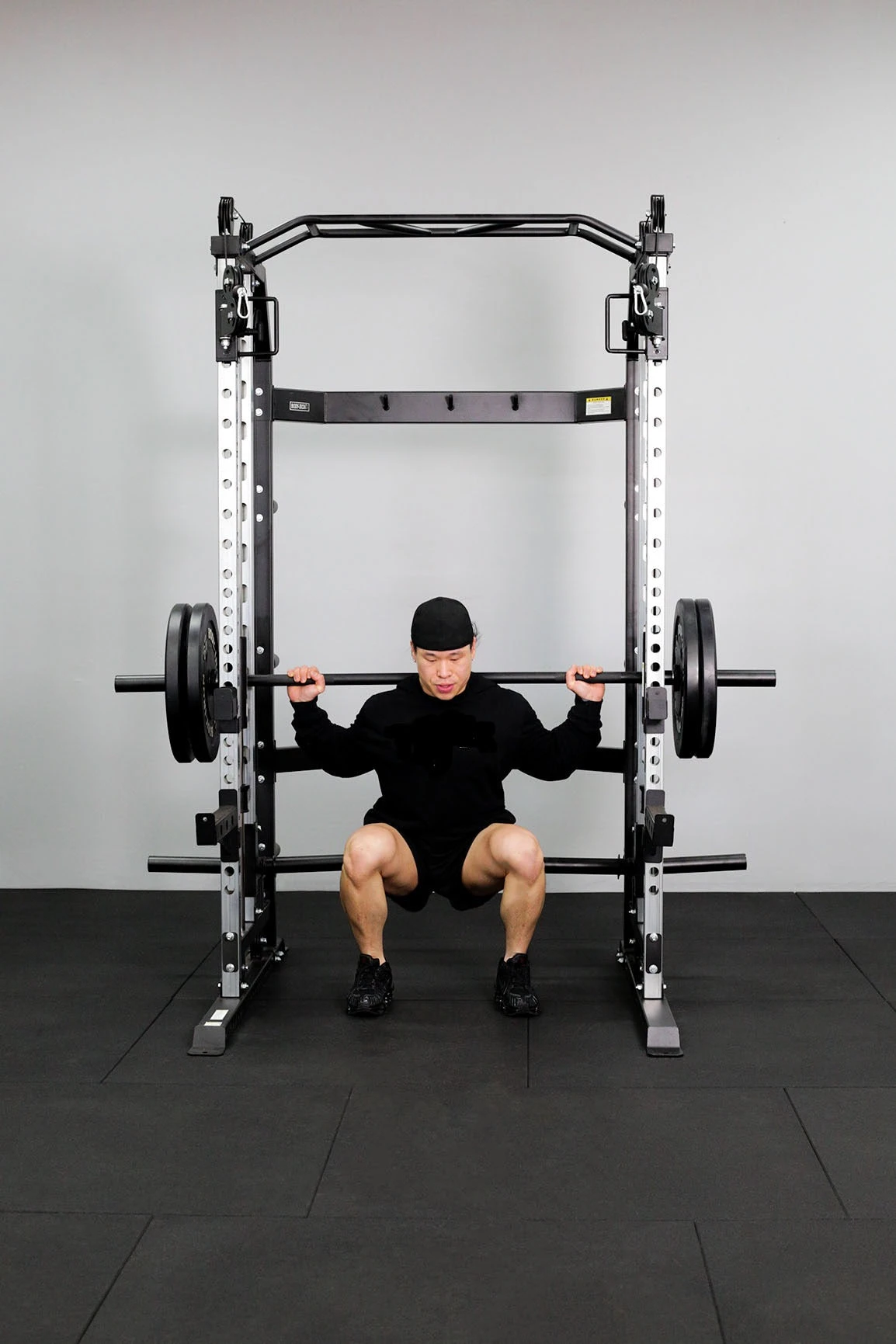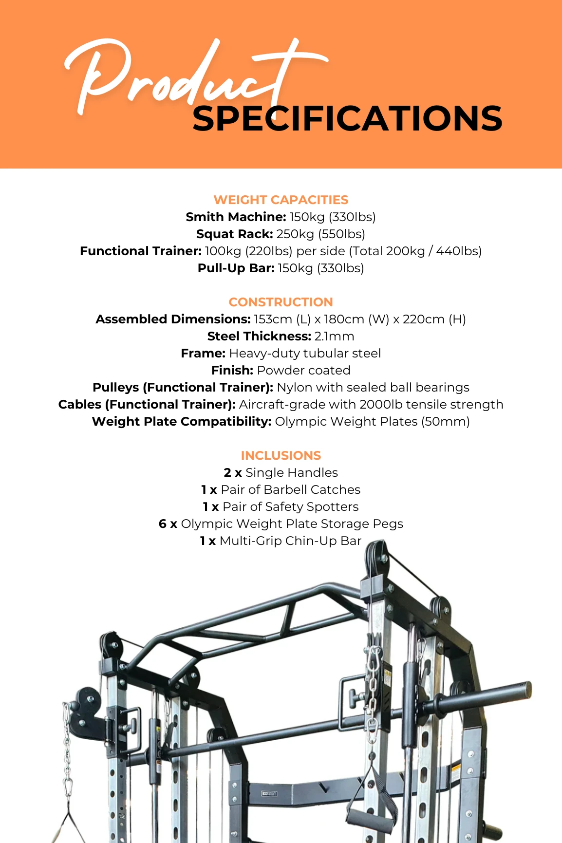 Effortlessly train any muscle group you like with this functional all-in-one training system. Target the upper body and chest with the multi-grip pull-up bar, single handles or smith machine. Train legs with the adjustable barbell catches and safety spotters to allow you to lift however you like without compromising form.