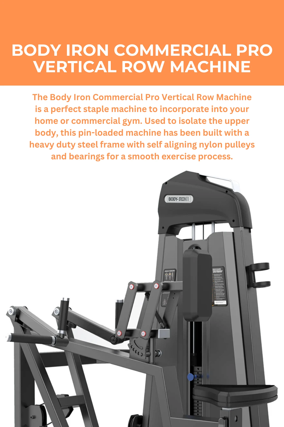 The Body Iron Commercial Pro Vertical Row Machine is a perfect staple machine to incorporate into your home or commercial gym. Used to isolate the upper body, this pin-loaded machine has been built with a heavy duty steel frame with self aligning nylon pulleys and bearings for a smooth exercise process.