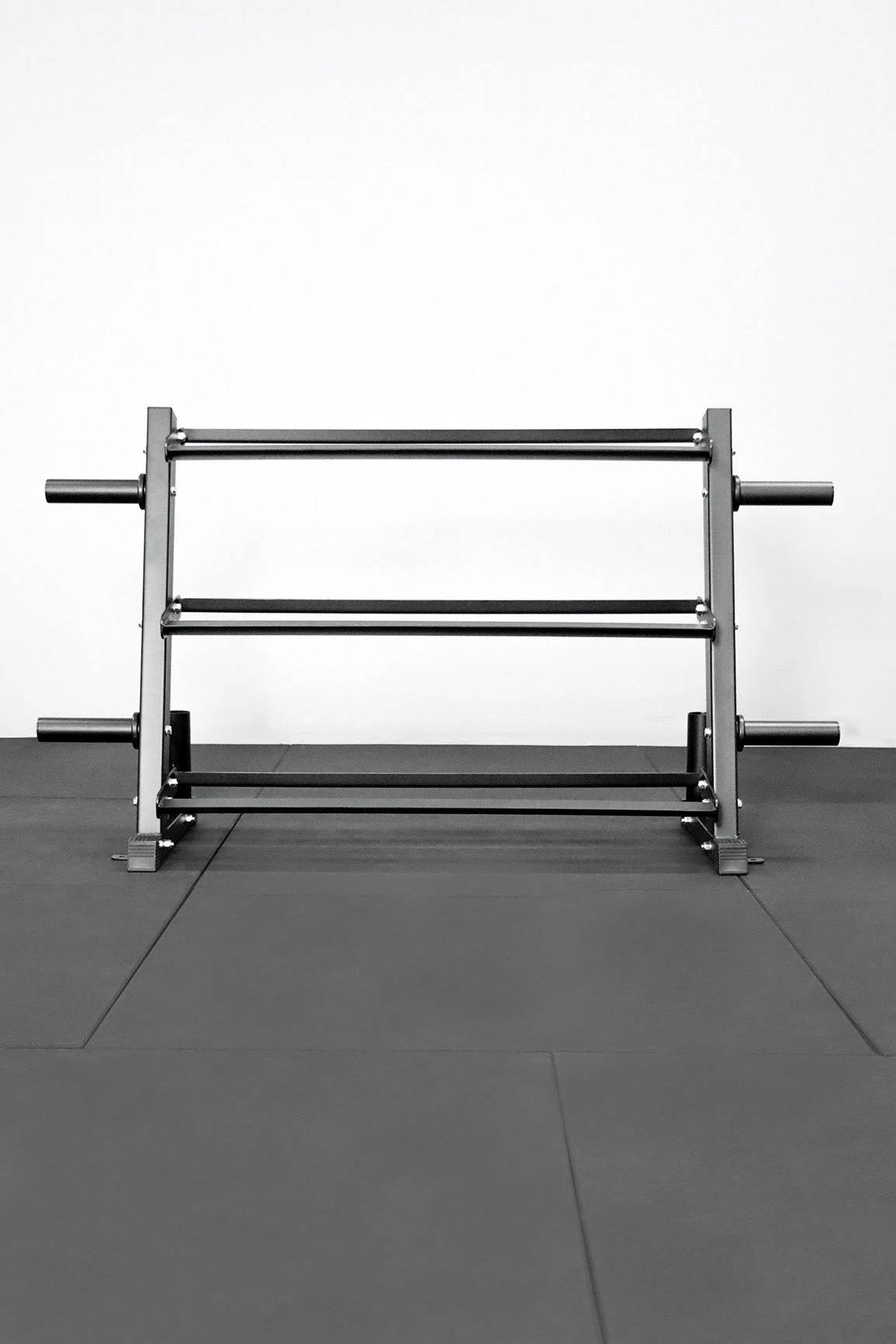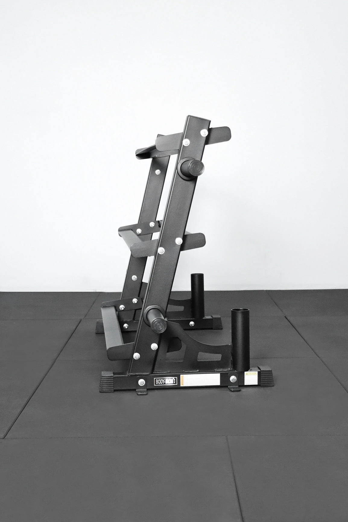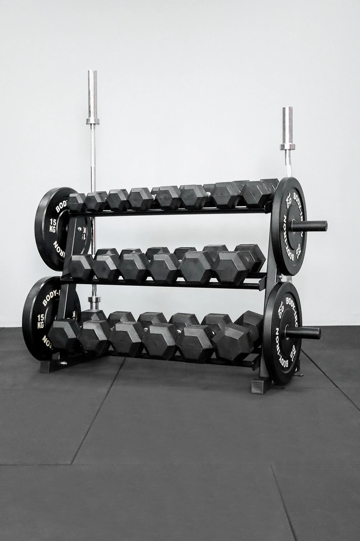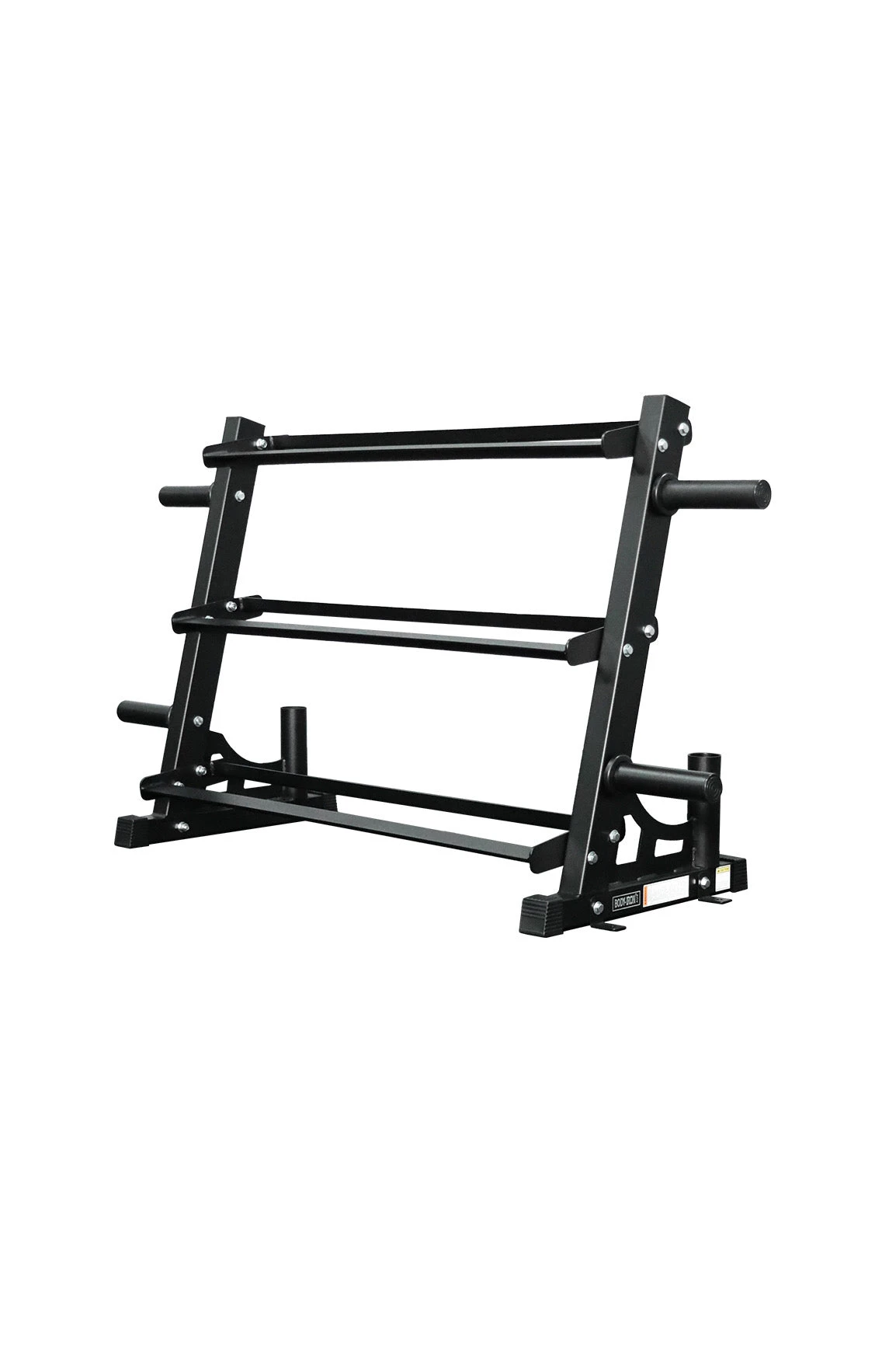 This weight rack includes 3 levels of dumbbell trays positioned at an appropriate angle for convenient handling and storage during workouts. It also has 4 holders for Olympic Plates and Bumpers, as well as 2 Barbell holders.