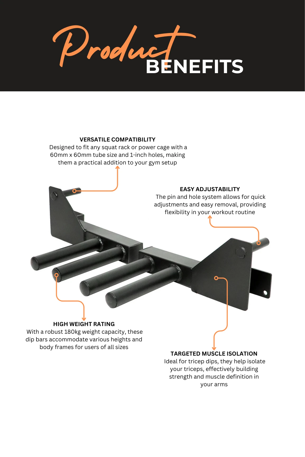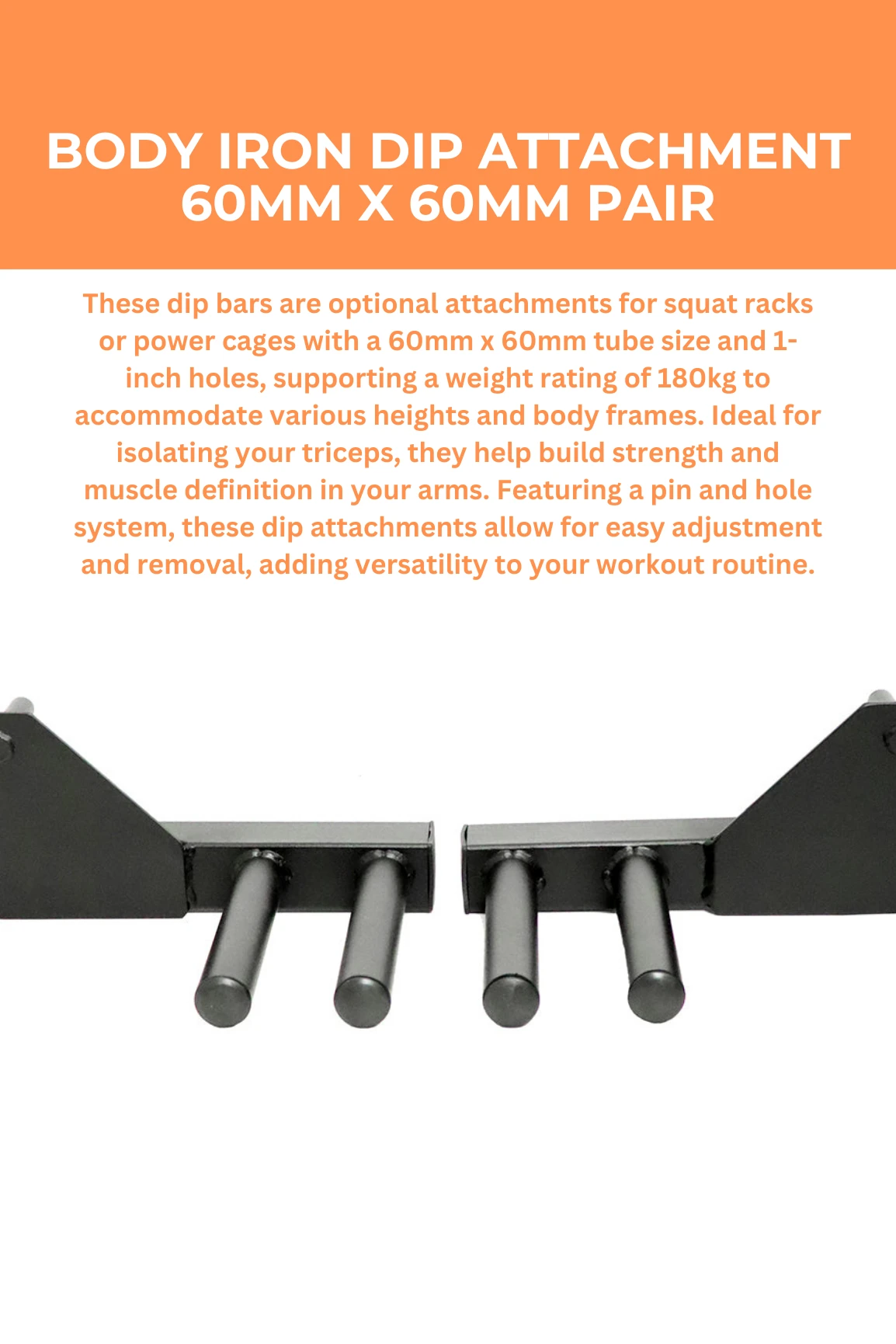 These dip bars are an optional attachment for any squat rack or power cage with 60mm X 60mm tube size and (1 inch hole).