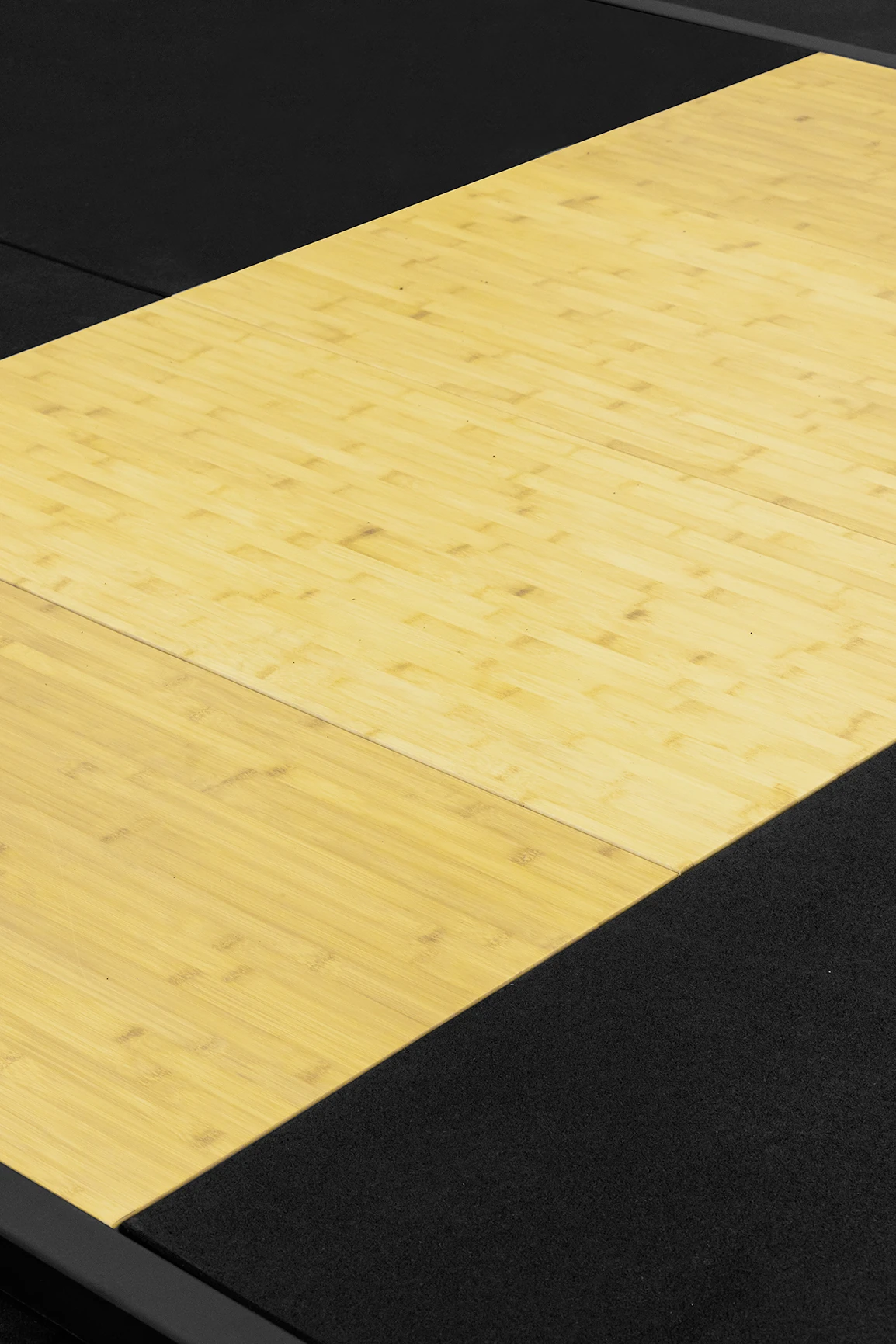 The lifting platform features a high-quality bamboo surface for strength and durability, supported by a solid plywood base underneath. This multi-layered construction provides excellent shock absorption, stability, and protection for both your equipment and flooring during heavy lifts.