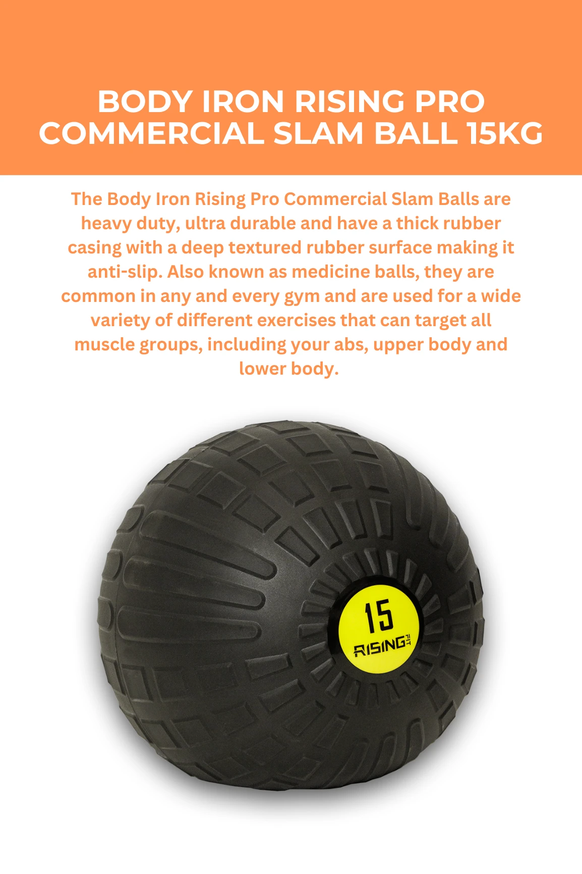 The Body Iron Rising Pro Commercial Slam Balls are heavy duty, ultra durable and have a thick rubber casing with a deep textured rubber surface making it anti-slip. Also known as medicine balls, they are common in any and every gym and are used for a wide variety of different exercises that can target all muscle groups, including your abs, upper body and lower body.