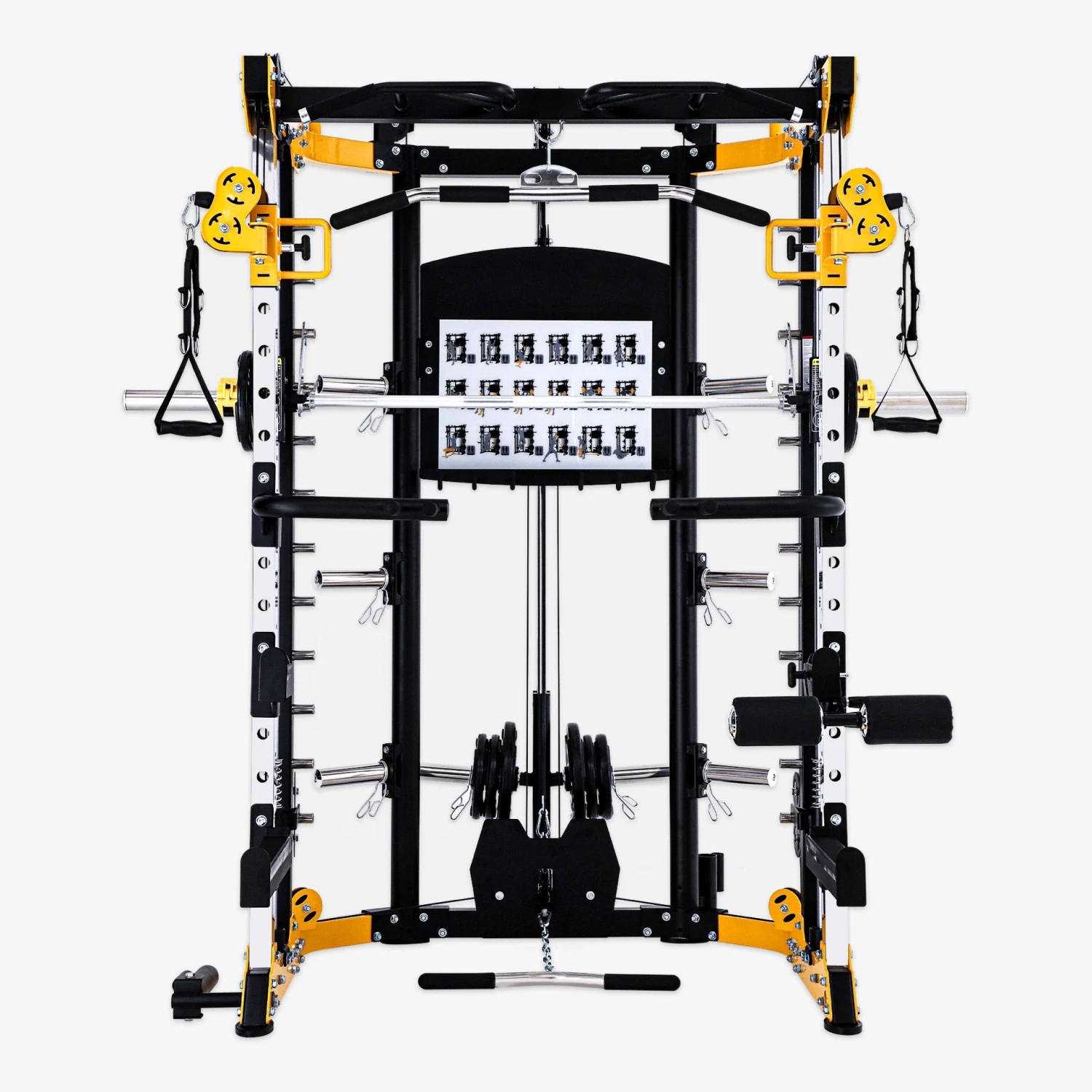 - Counterbalanced Smith Machine: Smooth bar travel with built-in linear bearings and safety catches—train solo with confidence.