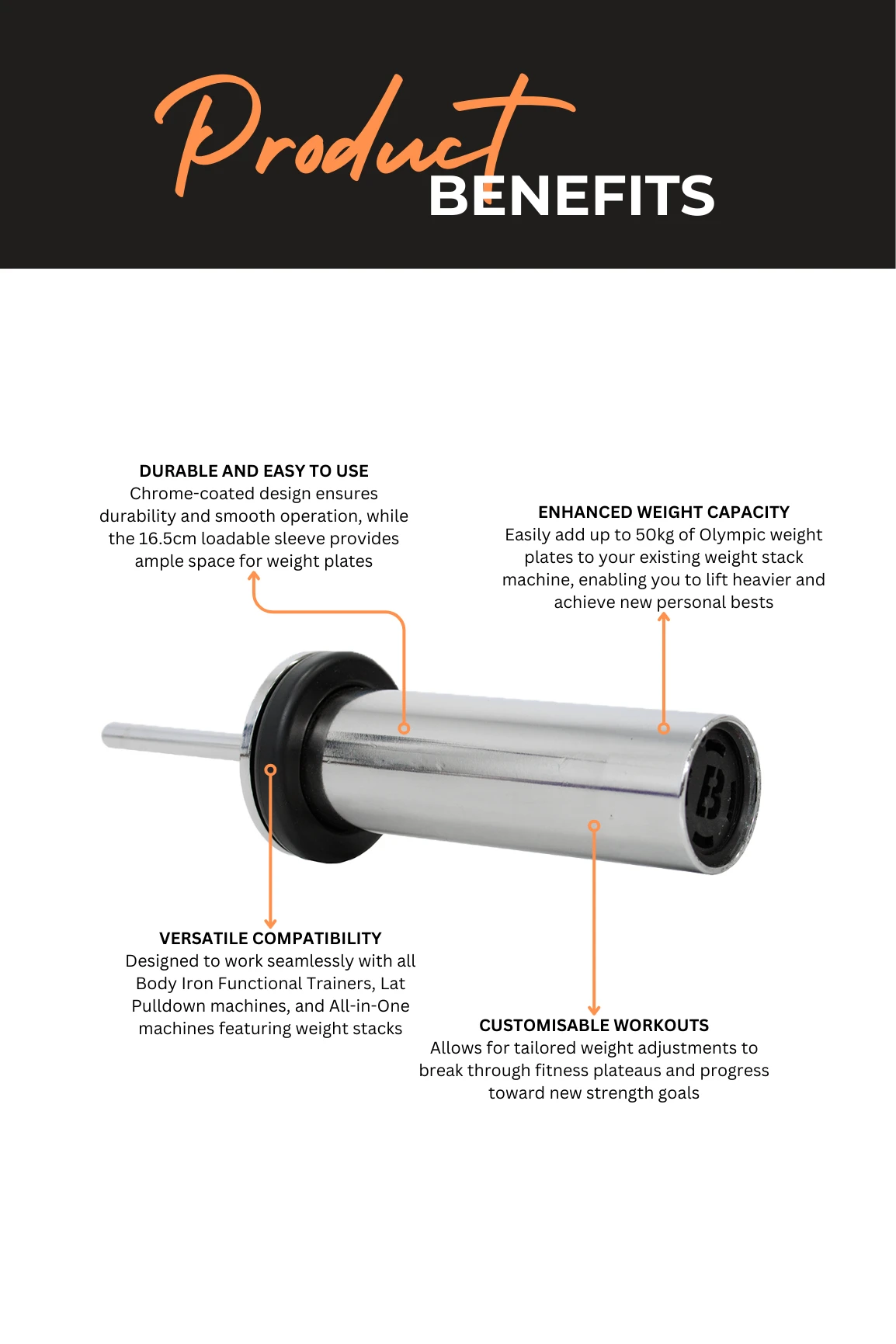 Body Iron Weight Stack Pin lets you add Olympic weight plates to your existing gym’s weight stacks, allowing you to lift heavier and achieve new fitness goals. It’s the perfect way to customize your workout and break through plateaus. Simply insert the Pin, load your plate, and get ready to push your limits!