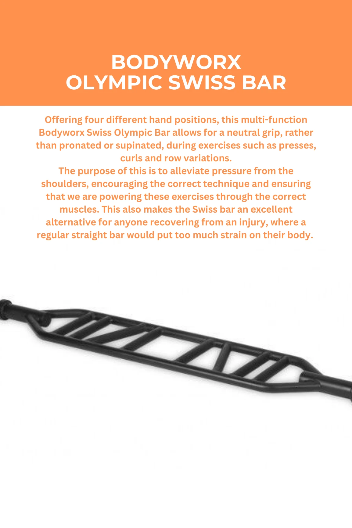 Offering four different hand positions, this multi-function Bodyworx Swiss Olympic Bar allows for a neutral grip, rather than pronated or supinated, during exercises such as presses, curls and row variations.