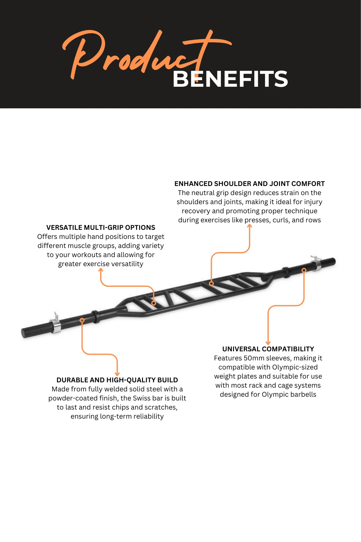 The purpose of this is to alleviate pressure from the shoulders, encouraging the correct technique and ensuring that we are powering these exercises through the correct muscles. This also makes the Swiss bar an excellent alternative for anyone recovering from an injury, where a regular straight bar would put too much strain on their body.Â