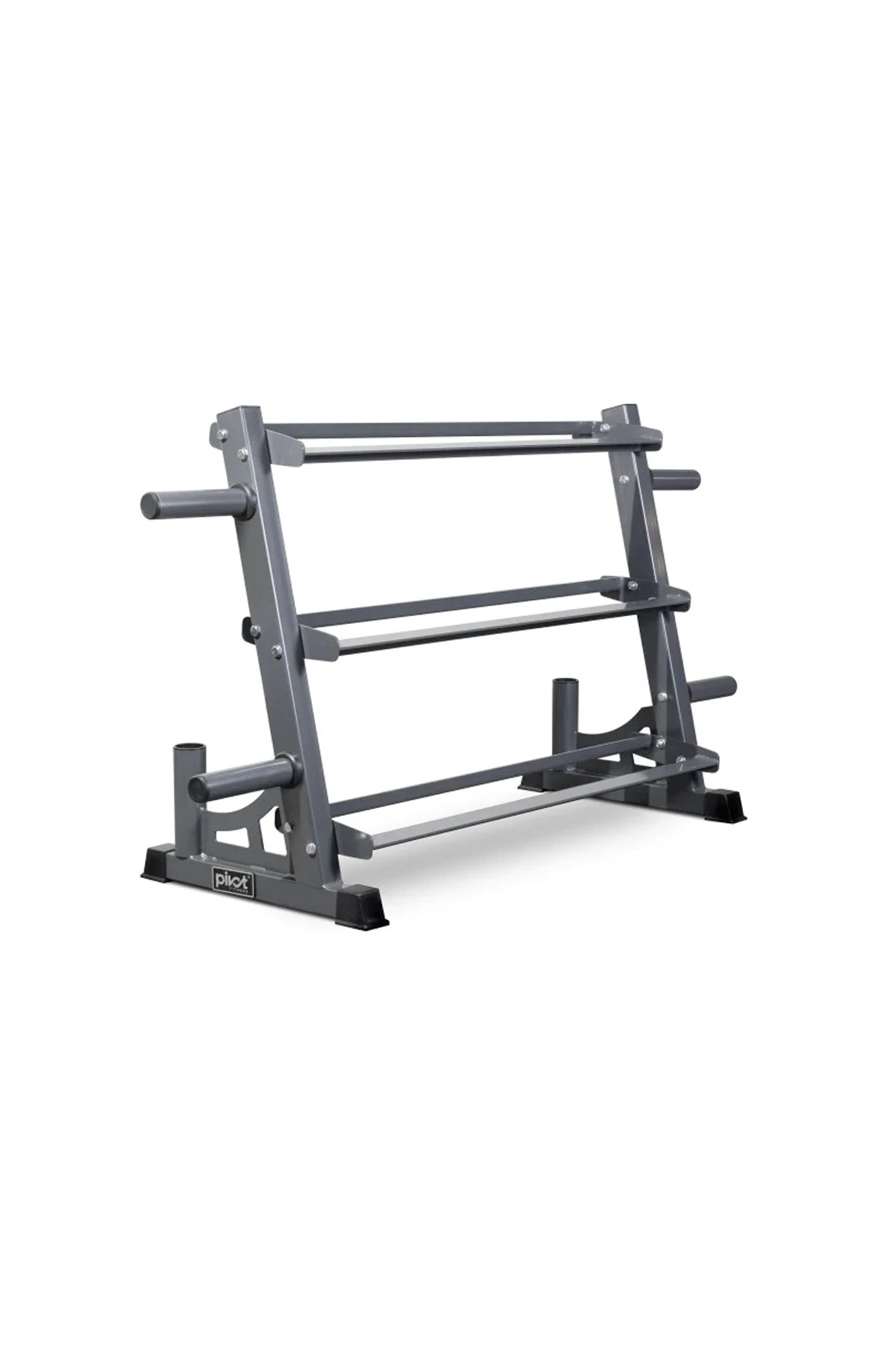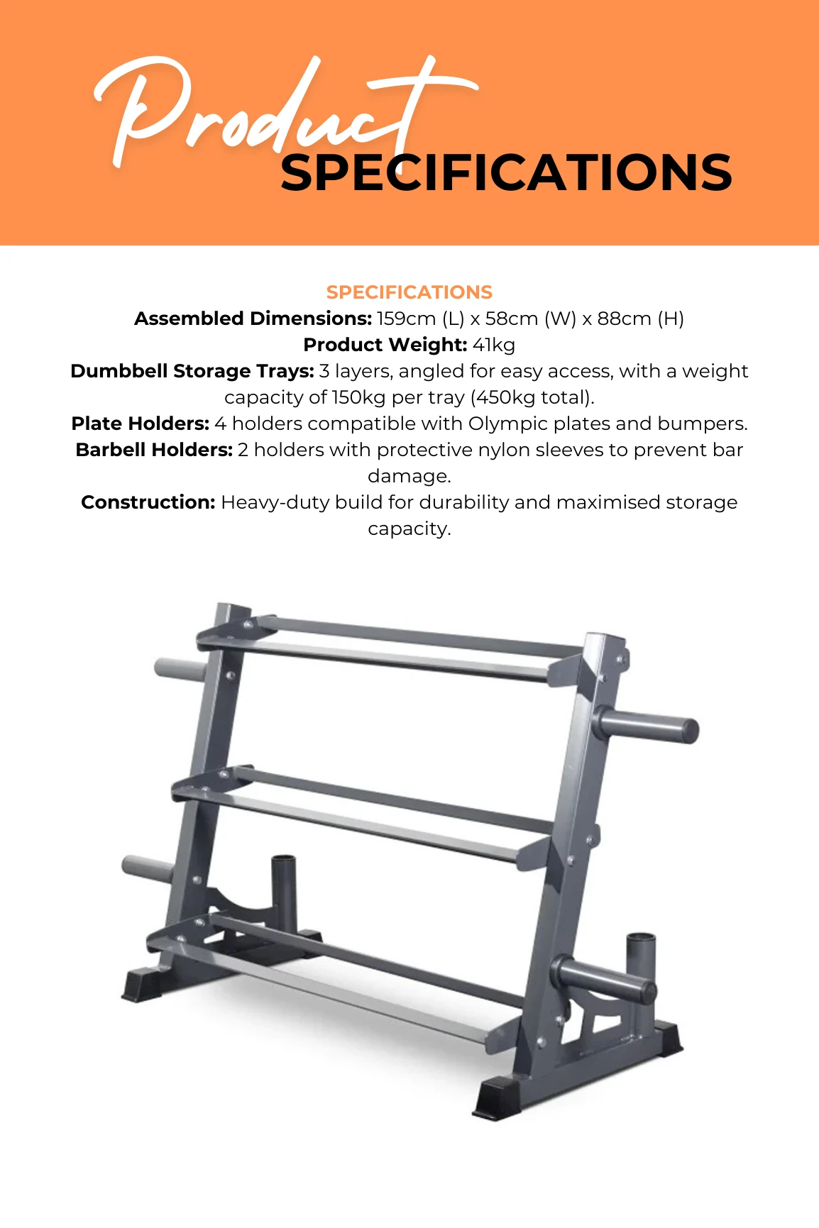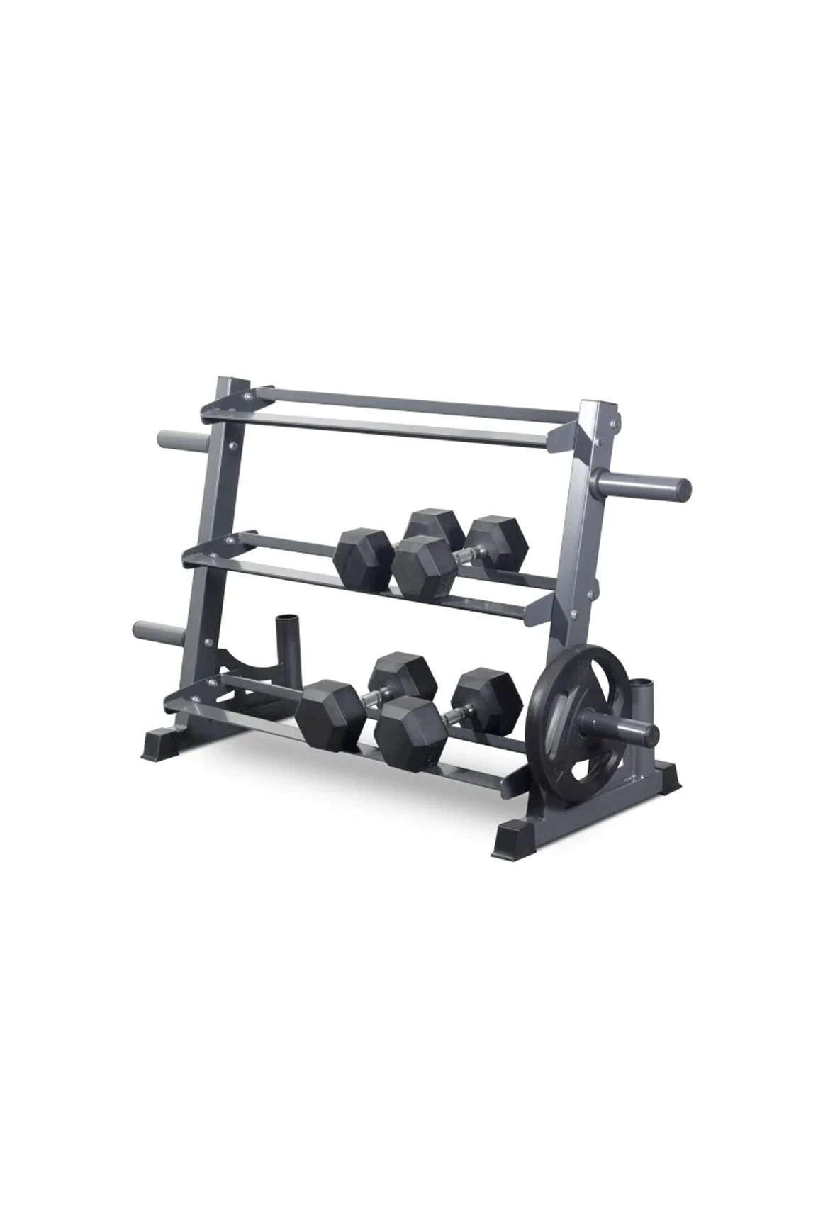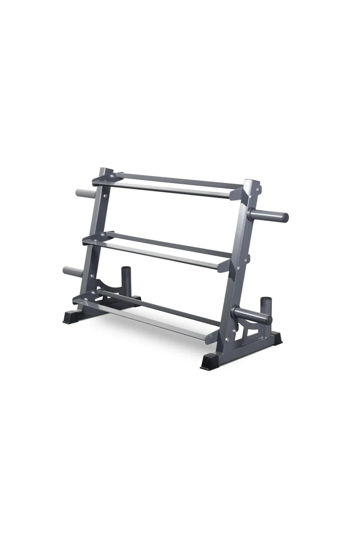 Featuring 3 layers of dumbbell storage trays that are located at a rational angle for easy taking and placing when in use. The rack also has 4x Plate holders that are compatible with Olympic Plates and Bumpers and 2x Barbell holders with nylon sleeves to ensure bar protection.