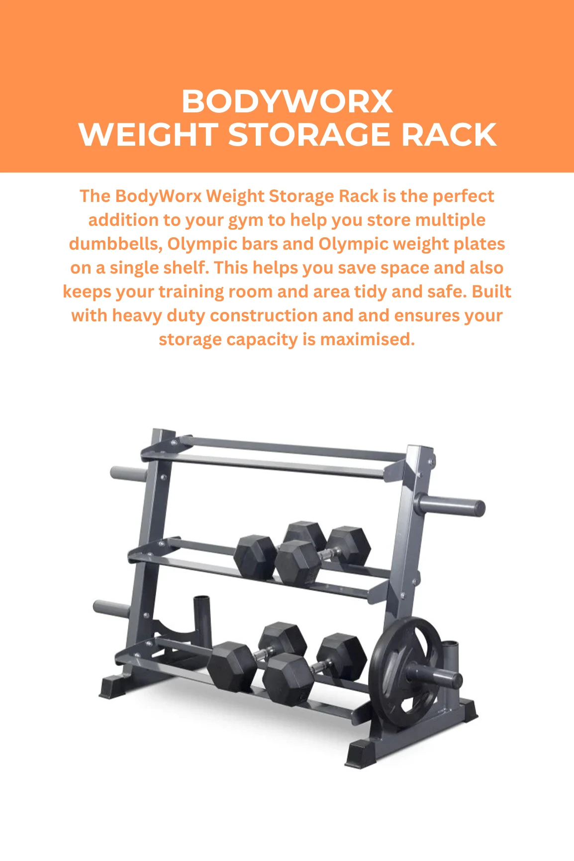 The BodyWorx Weight Storage Rack is the perfect addition to your gym to help you store multiple dumbbells, Olympic bars and Olympic weight plates on a single shelf. This helps you save space and also keeps your training room and area tidy and safe. Built with heavy duty construction and and ensures your storage capacity is maximised.