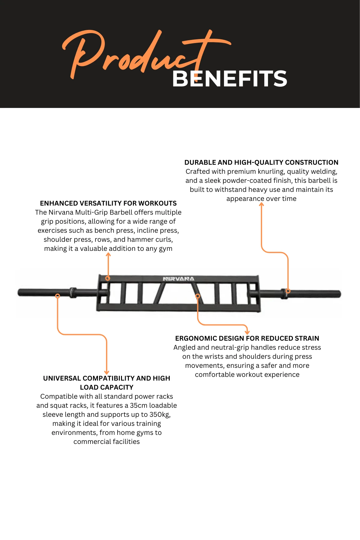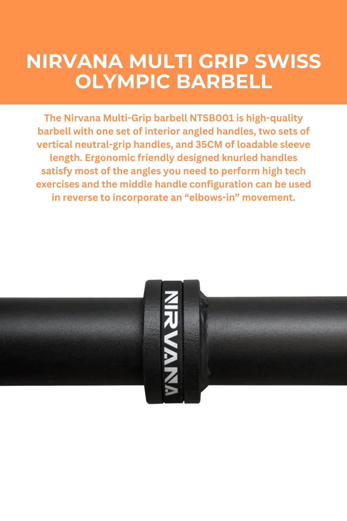 The Nirvana Multi-Grip barbell NTSB001 is high-quality barbell with one set of interior angled handles, two sets of vertical neutral-grip handles, and 35CM of loadable sleeve length. Ergonomic friendly designed knurled handles satisfy most of the angles you need to perform high tech exercises and the middle handle configuration can be used in reverse to incorporate an “elbows-in” movement.