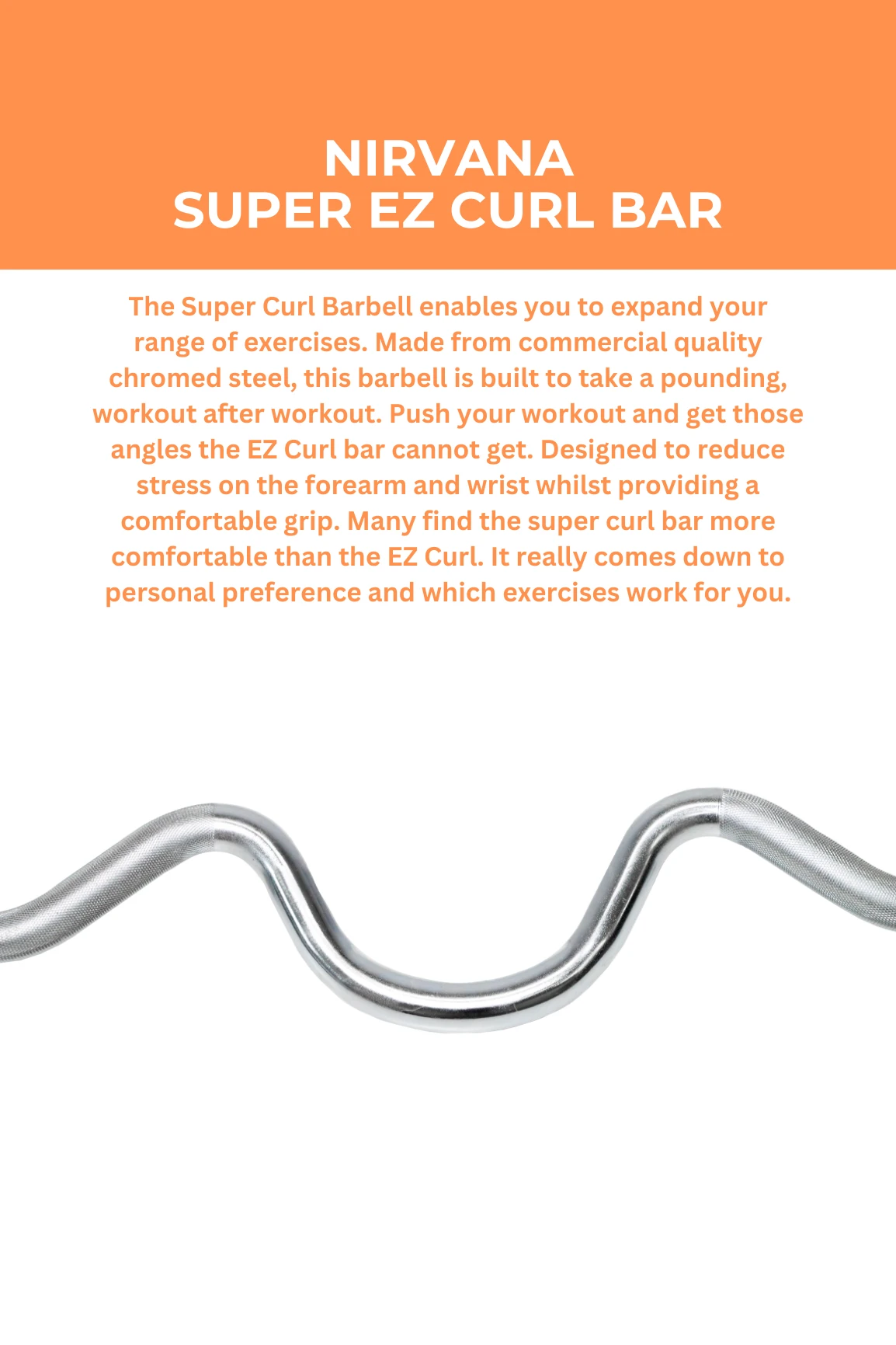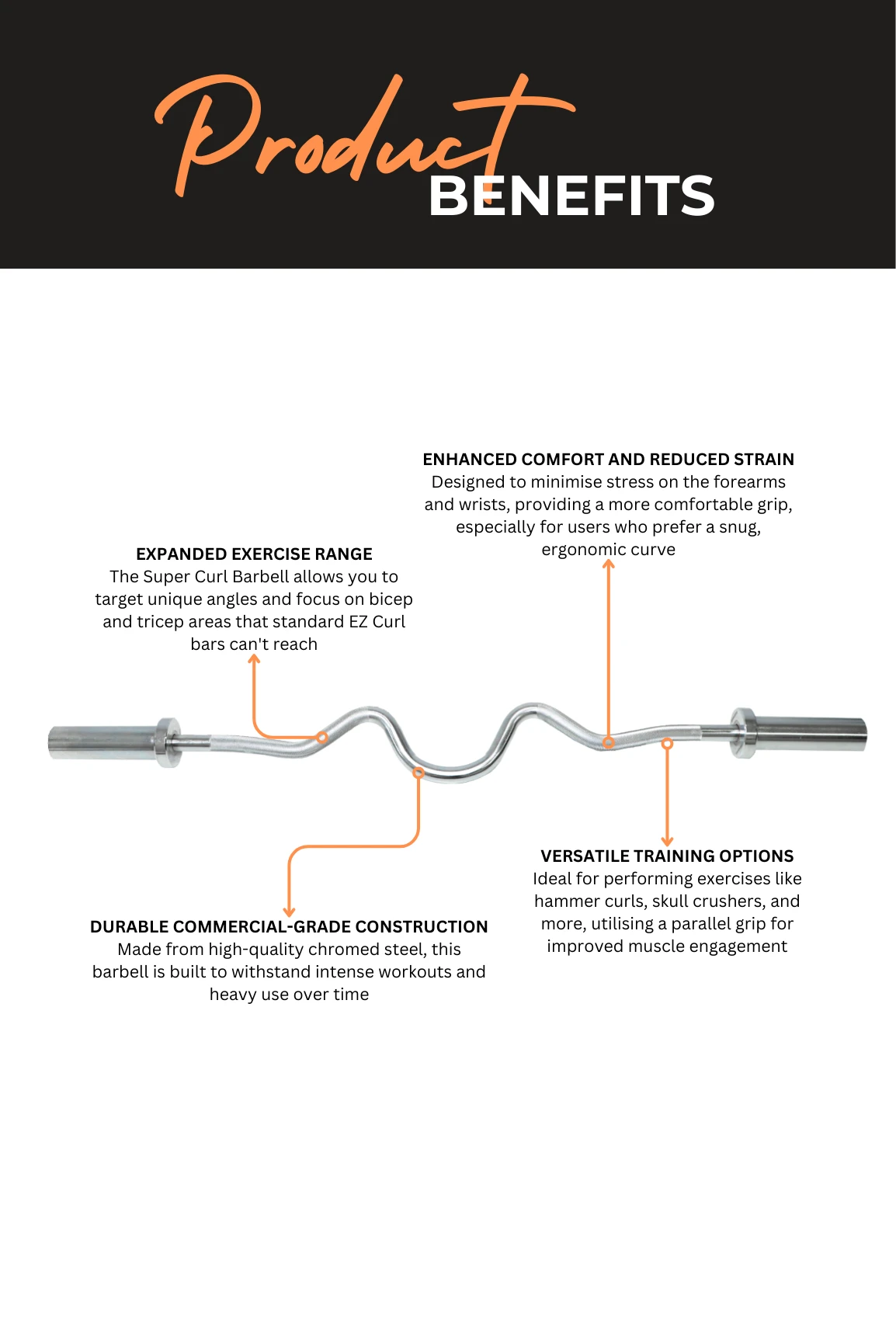 The Super Curl Barbell enables you to expand your range of exercises. Made from commercial quality chromed steel, this barbell is built to take a pounding, workout after workout. Push your workout and get those angles the EZ Curl bar cannot get. Designed to reduce stress on the forearm and wrist whilst providing a comfortable grip. Many find the super curl bar more comfortable than the EZ Curl. It really comes down to personal preference and which exercises work for you.
